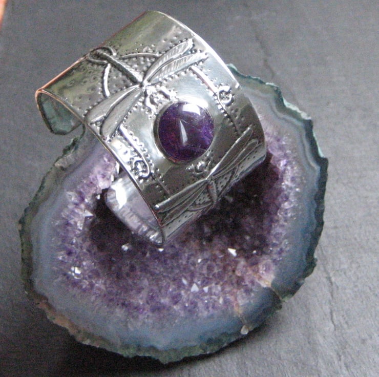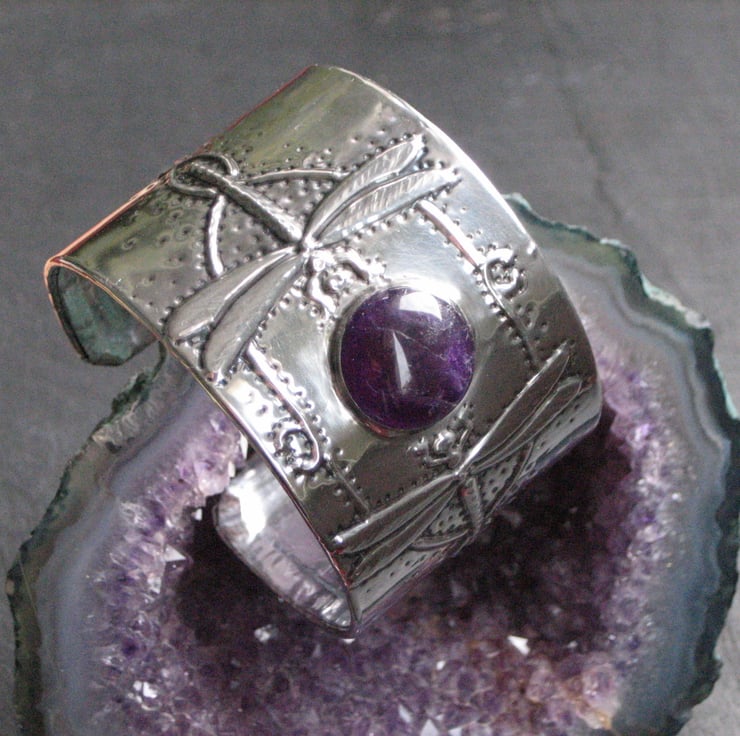 Last minute gift. Silver dragonfly pewter cuff bracelet handmade with amethyst. This beautiful Art Nouveau style cuff bangle, measuring 38mm deep and 155mm long in an incomplete circle, has been made by hand from sheet pewter and set with a genuine amethyst cabochon. This unique piece of statement jewellery would make a perfect gift for a special woman for a birthday, Christmas or 10th Wedding Anniversary.