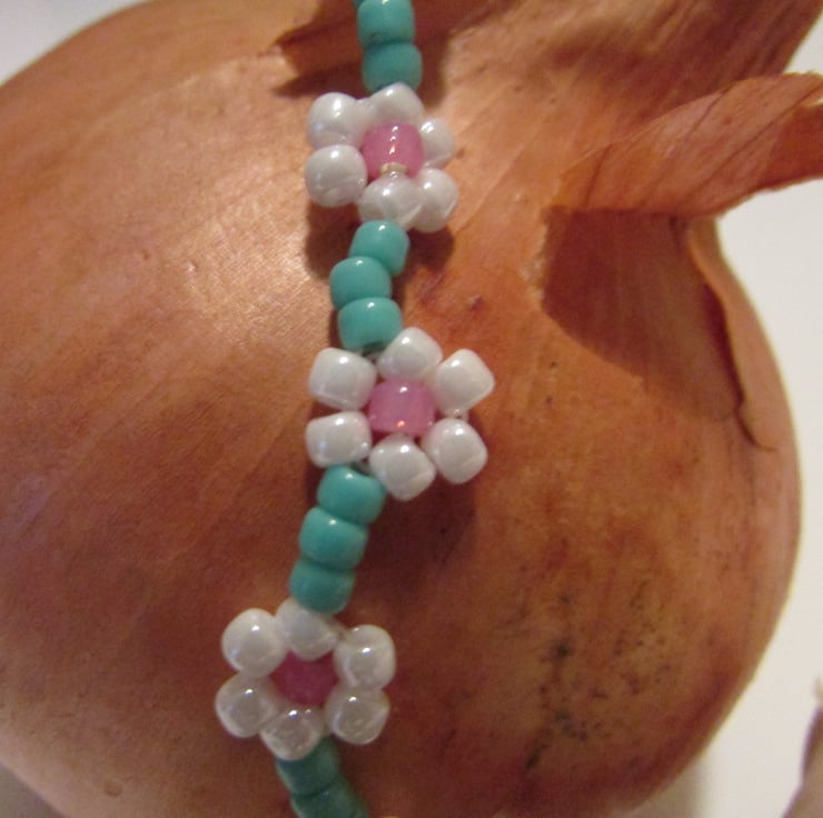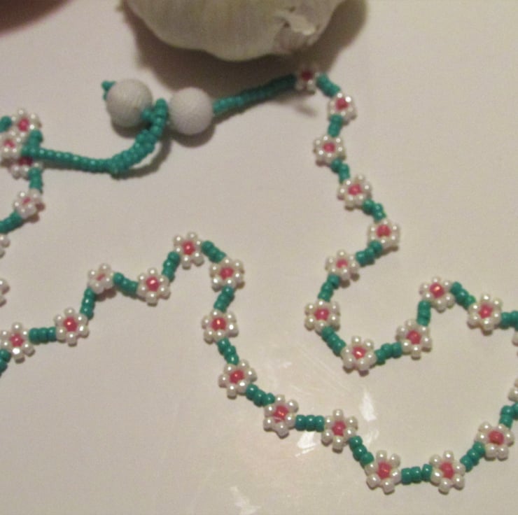 Very pretty daisy chain necklace made with size 8 seed beads in turquoise with white daisies, the necklace is fastened by a seed bead loop and two round textured beads, which makes the necklace adjustable in length. This necklace measures 46cm omitting the fastening.