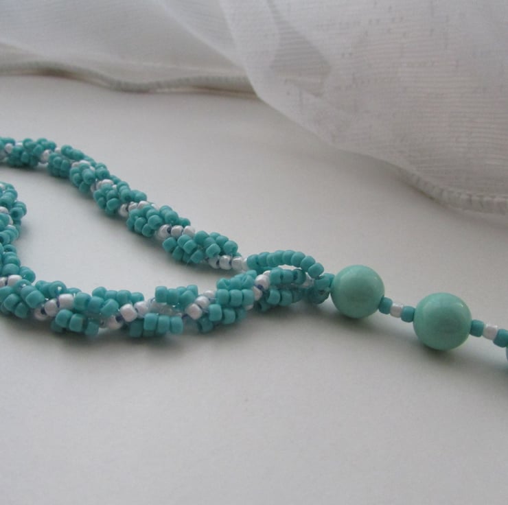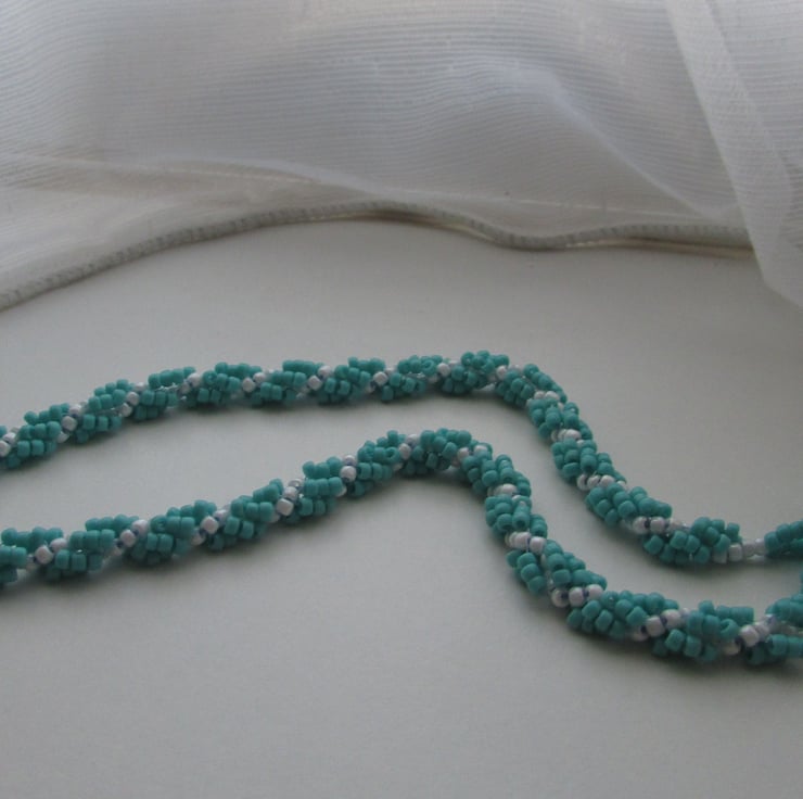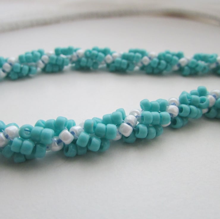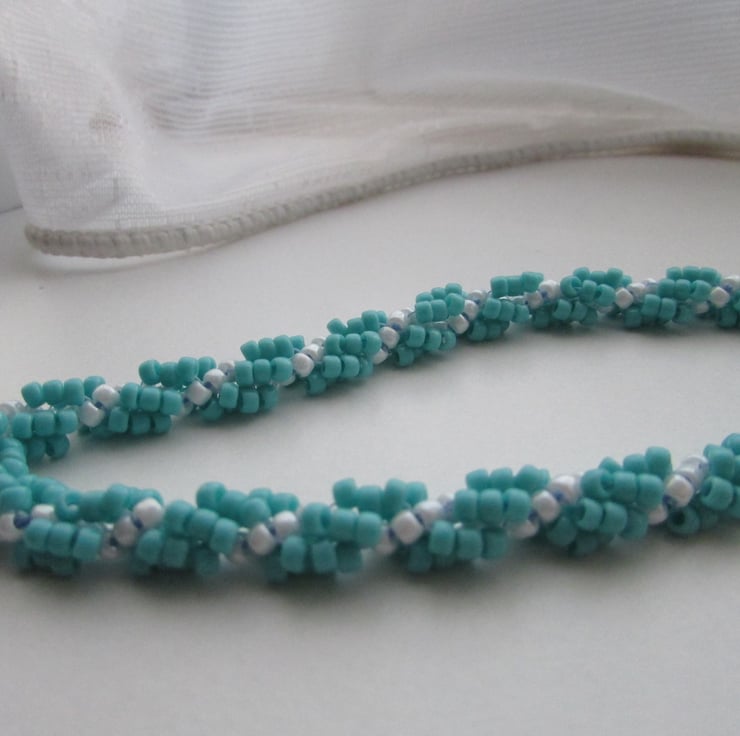 Very pretty turquoise and white colour spiral stitch necklace, which is fastened by a seed bead loop and three 8mm turquoise beads, this kind of fastening makes the necklace length adjustable, it can be worn with the fastening to the front or to the back. The necklace measures 46cm omitting the fastening.