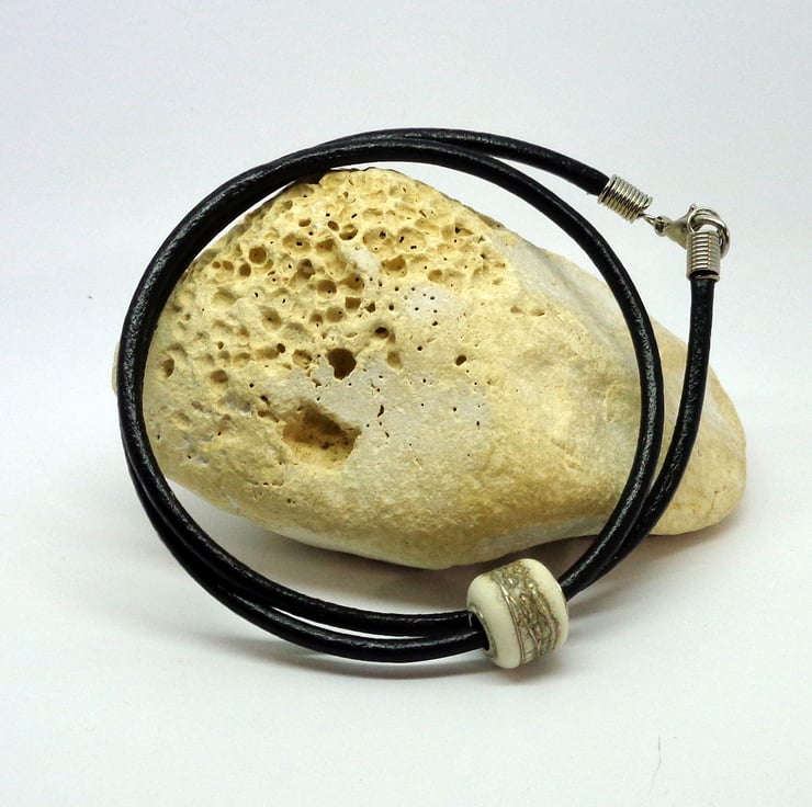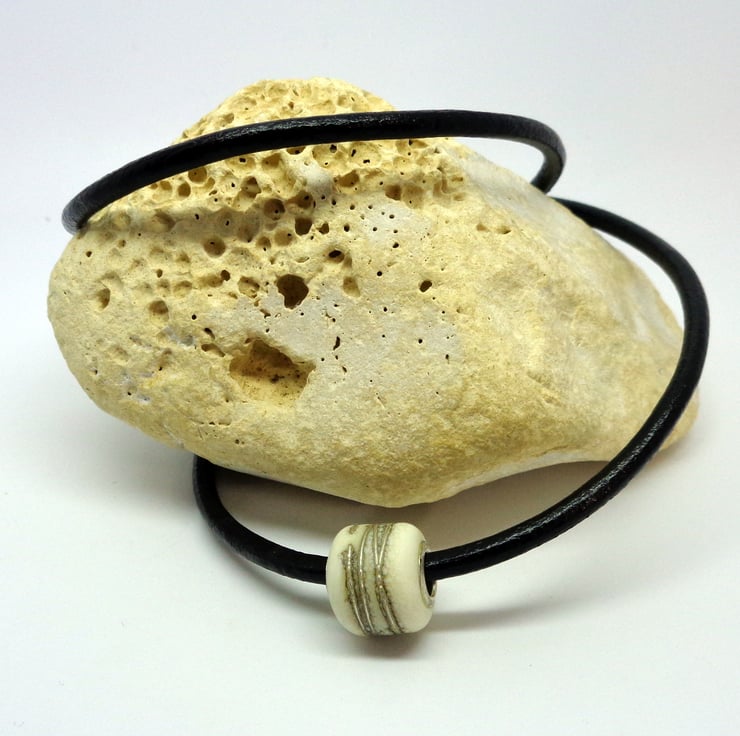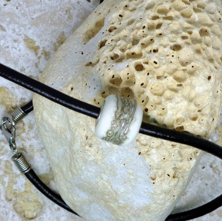 The focal bead is handmade torched glass & was sourced from a talented UK glass artist. The ivory colour has a broad central trail of fine silver, making it truly unique. The core is 925 sterling silver.