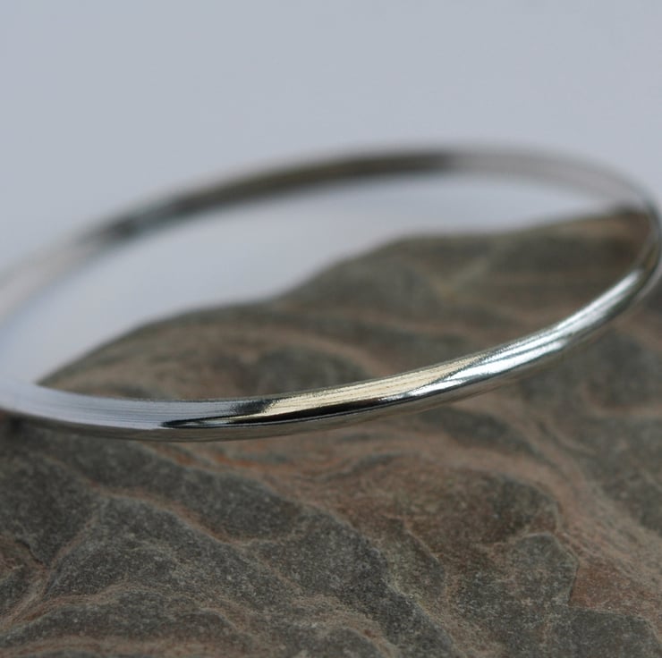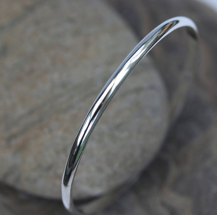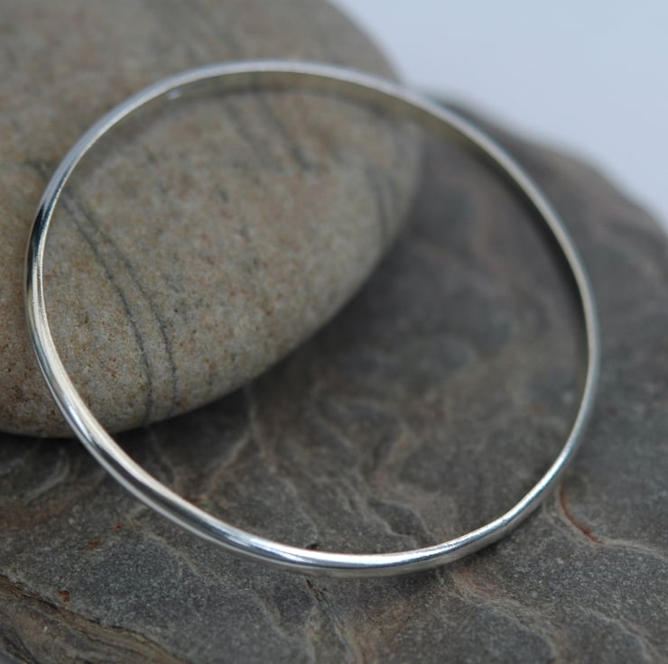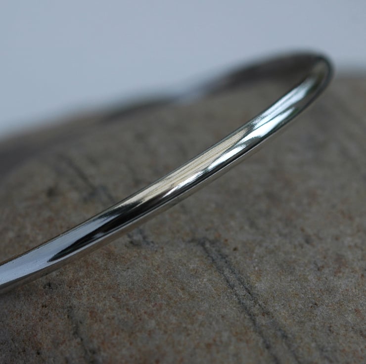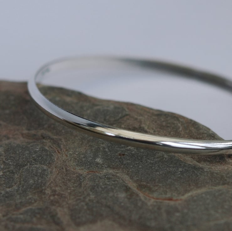This classically simple D-profile bangle radiates timeless elegance. You can wear it on its own or with others. It is made from D-profile sterling silver, 4mm wide and weighing 14g, which gives it a solid and substantial feel. The internal diameter is 6.7cm, a generous medium size. Traditional silver hallmarks including my own maker's mark have been applied by the London Assay Office. It has been tumble-polished to a bright shine, but I can easily give it a matt finish if you prefer.