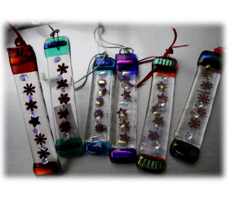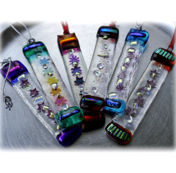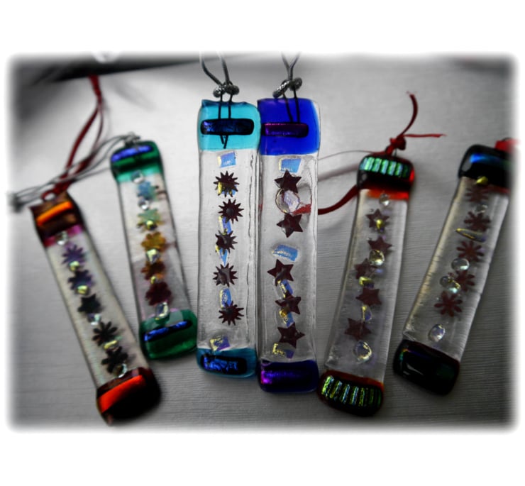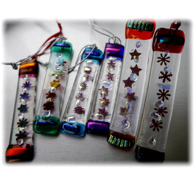I've then tipped the ends with brightly coloured glass, decorated with matching precious dichroic glass and spots of clear dichroic between the stars.