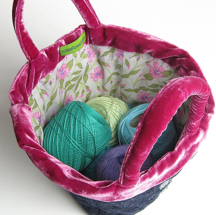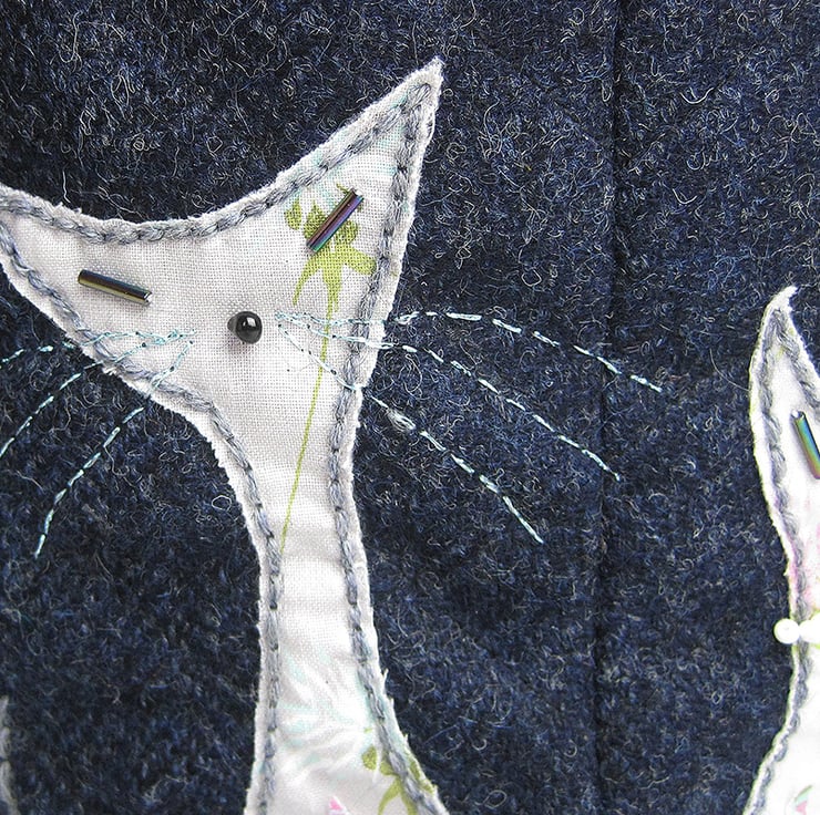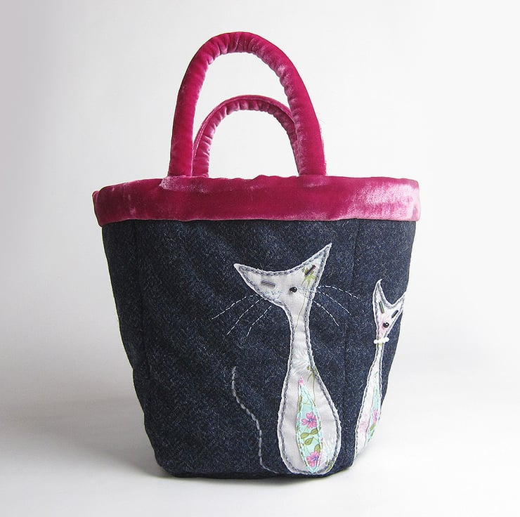 This has been made using navy blue wool type fabric and has been hand appliquéd with two mid century modern cats. The outer has been quilted to add structure. The handles and trim are made from pink silk velvet and the bag is lined in my own campion print on cotton.