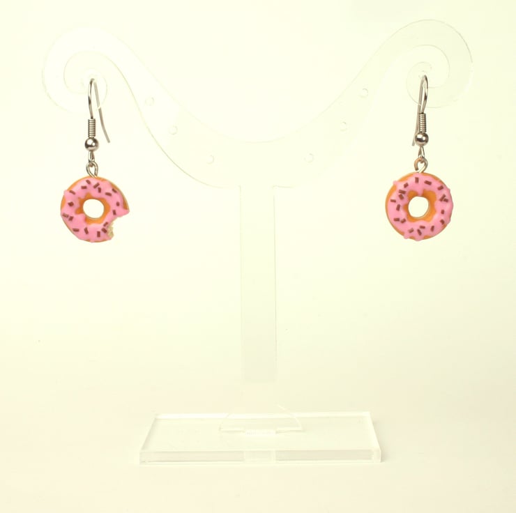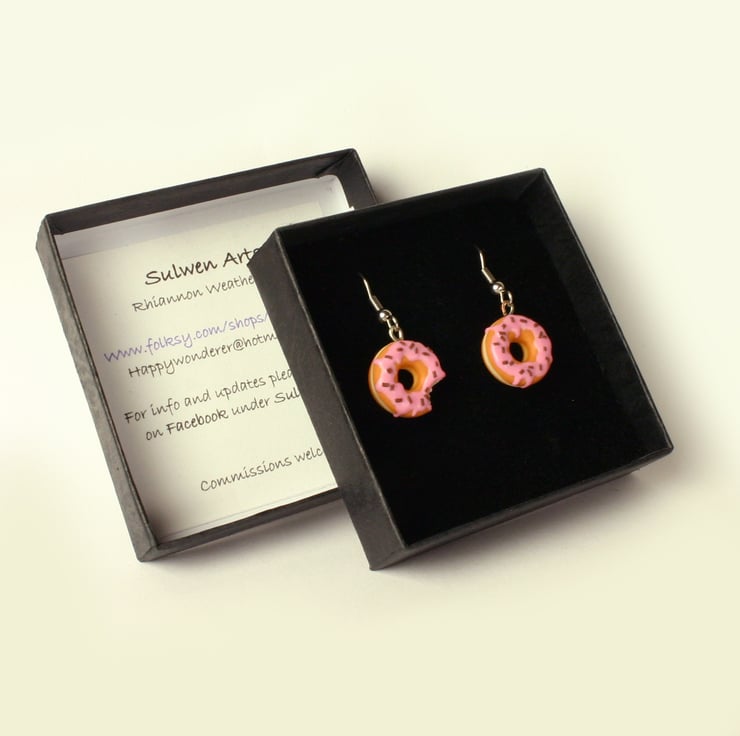 These Pink doughnut earrings have been meticulously handmade using polymer clay and hung on surgical steel ear wires, and they come with a lovely black gift box.