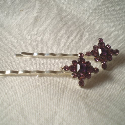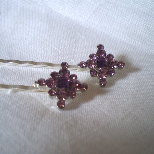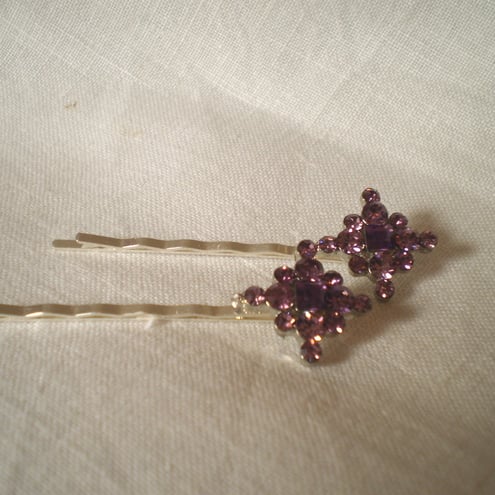 Steampunk recyling at it's best. Two hair pins, created from recycled Swarovski (no logo) earrings, beautiful purple oblong centre crystals, complimented by smaller stones.. Keep one and give the other as a gift. Perfect for a special occasion or just to add sparkle to your hair.