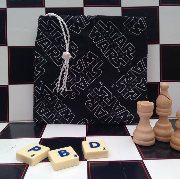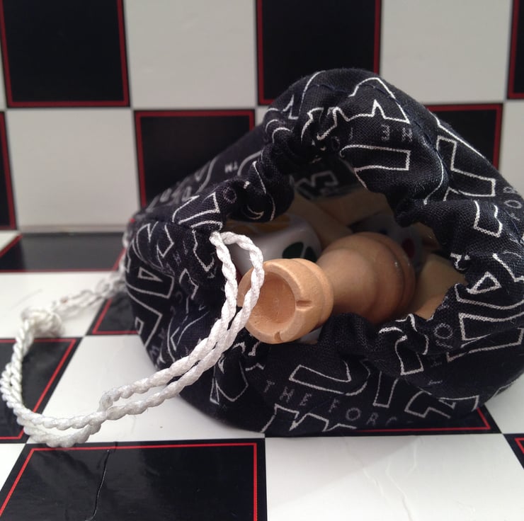 Fantastic Little Handmade Fabric Dice Bag for storing Dice, Tokens, Cards, Chess Pieces, Counters, Tiles, Conkers. Be the envy of friends with this Drawstring Bag, made out of fabric with Star Wars writing on
