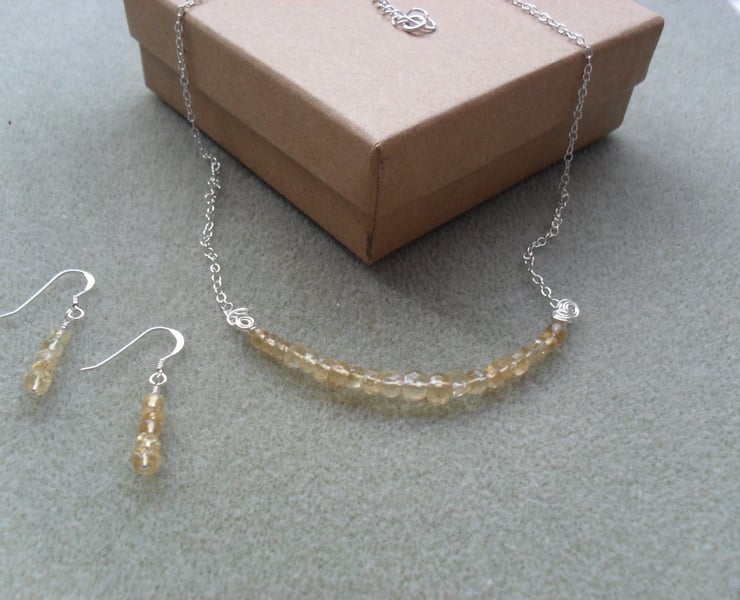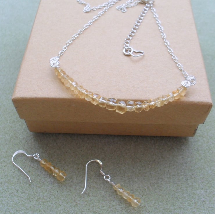 Citrine gemstones which have been faceted to give a lovely sparkle have been attached to sterling silver chain with sterling silver wire. I have coiled the wire to form spirals where it joins the chain to give a little decoration.