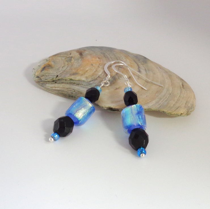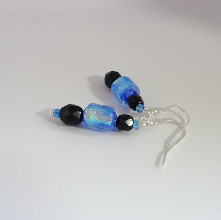 The rest is easier; faceted black glass beads, blue seed beads, silver plated headpins & sterling silver hooks. The drop from the top of the hook to the tip is almost 5cms.