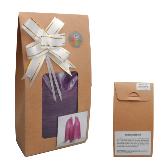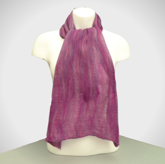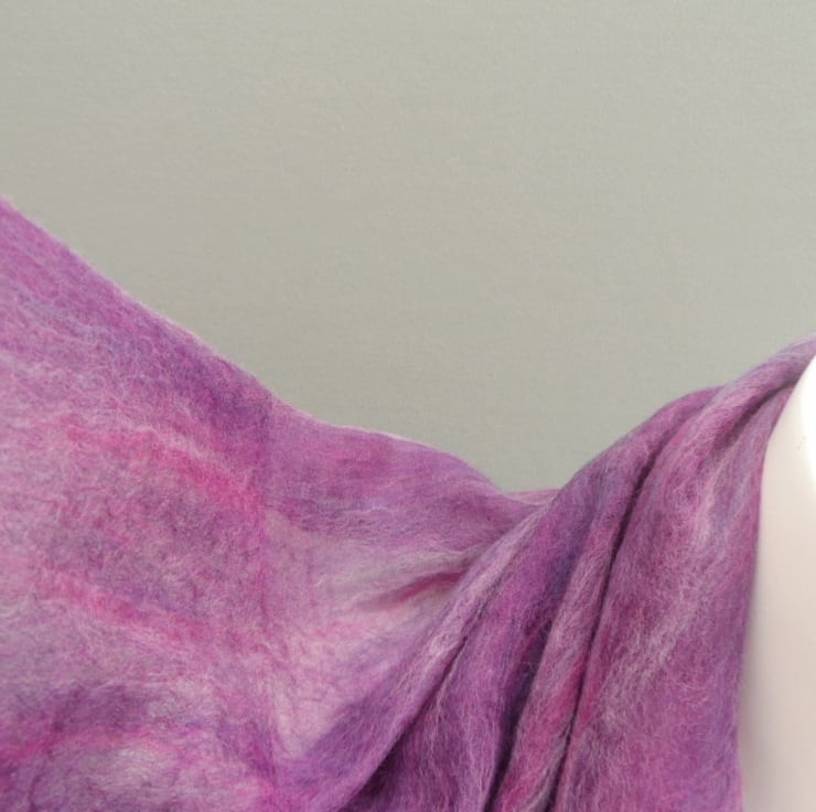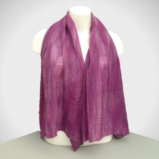 This stunning nuno felted silk scarf has been made using a blend of gorgeously soft merino wool in various shades of purple and pink. A very fine layer of woollen fibres have been laid over a dark purple silk chiffon base scarf and nuno felted to it. The scarf has been felted on both sides.