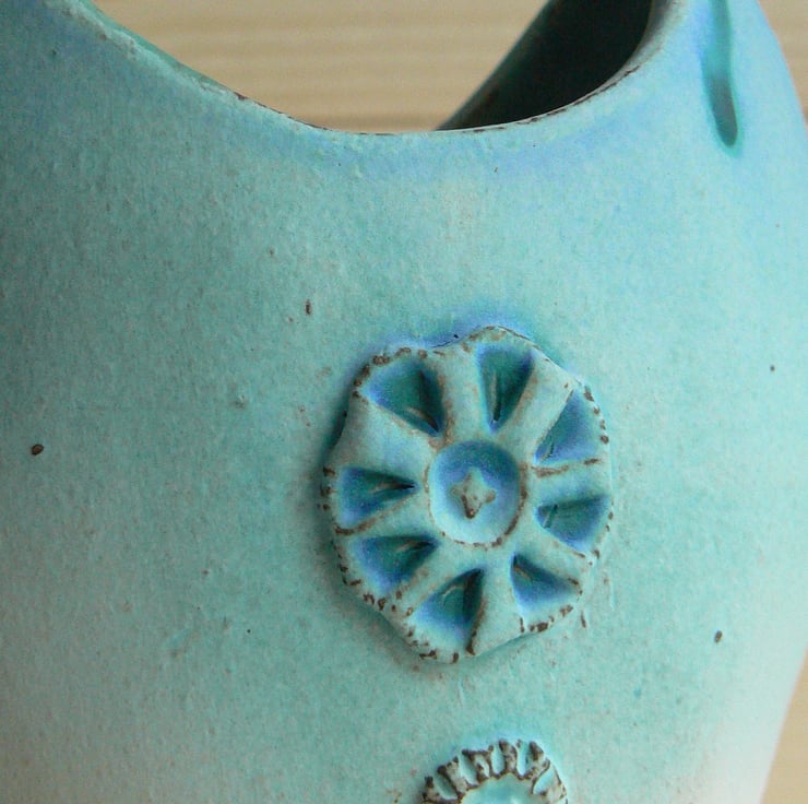 The vase has raised patterned decoration which has been highlighted by my dry turquoise glaze, inside there is a shiny white glaze to make cleaning easier.