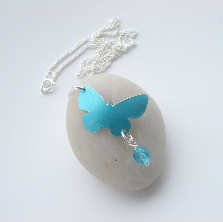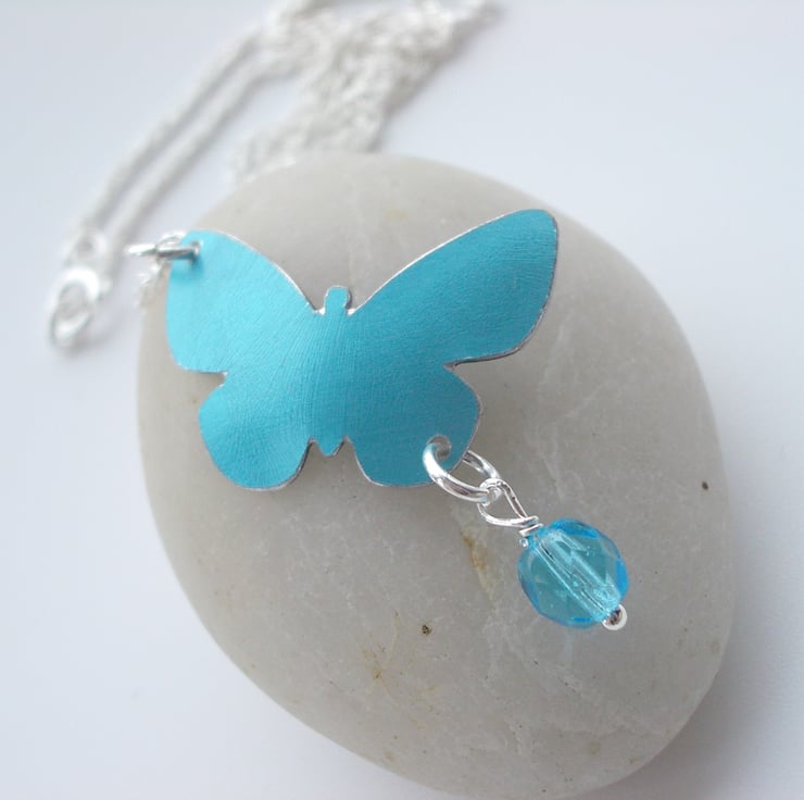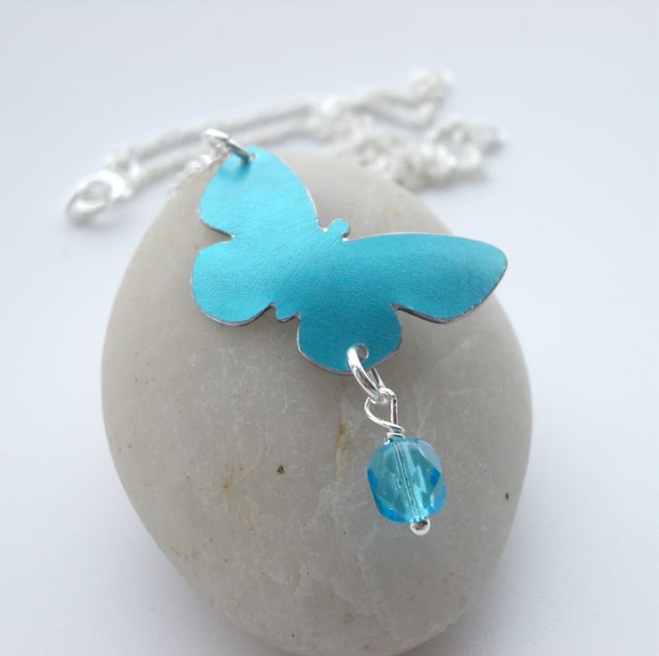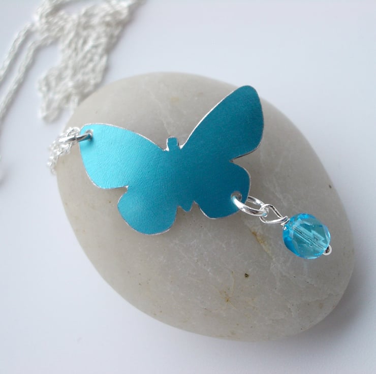 This delicate butterfly pendant has been made from aluminium which I have dyed a fresh turquoise colour. I then seal the dye so that it becomes a permanent part of the metal before cutting out the butterfly shape using a piercing saw. I have domed the butterfly slightly so that it catches the light. To finish I have added a turquoise crystal bead on a sterling silver pin, which picks up the colour in the pendant.