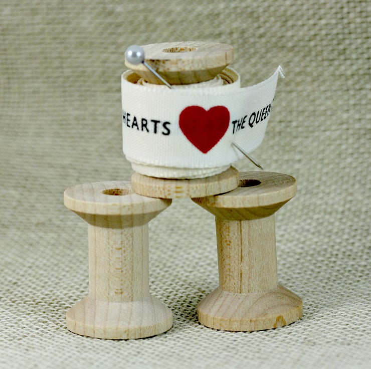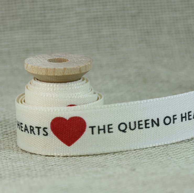 1 metre of This Ribbon "Queen of Hearts" natural ribbon. The repeat pattern features the printed motto in black capitals, with large true red hearts.