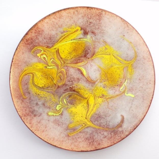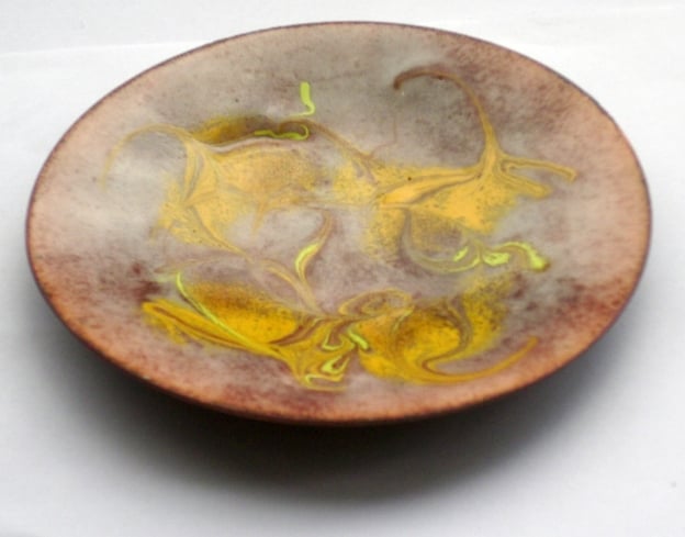 This dish is decorated with swirls of yellow scrolled over brown.