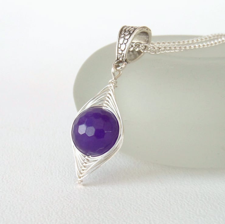 A lovely handmade necklace, with a wire wrapped purple malayan jade gemstone as the focus.