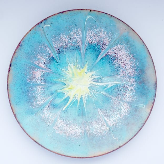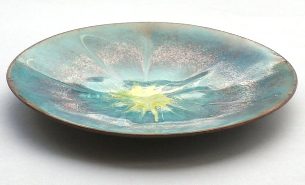This dish has a stylised flower pattern i make by drawing a steel tip through the red hot enamel from the centre to the edge tnen reversing the direcrion of the stroke to push through the outer ring, in this case white scattered with mauve enamel powder.