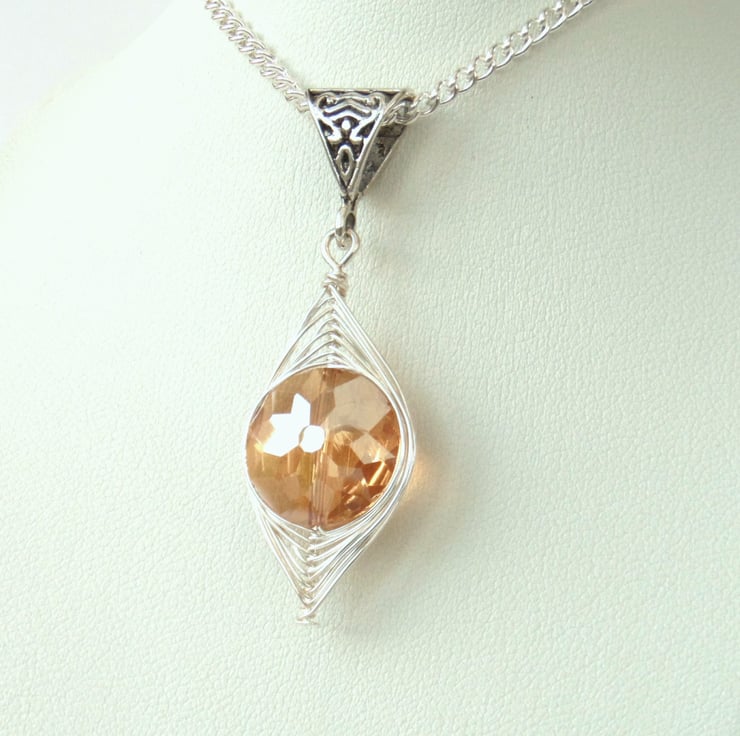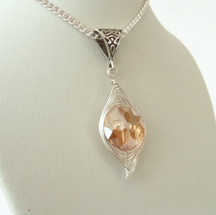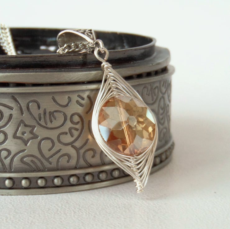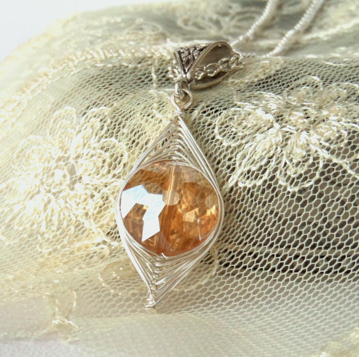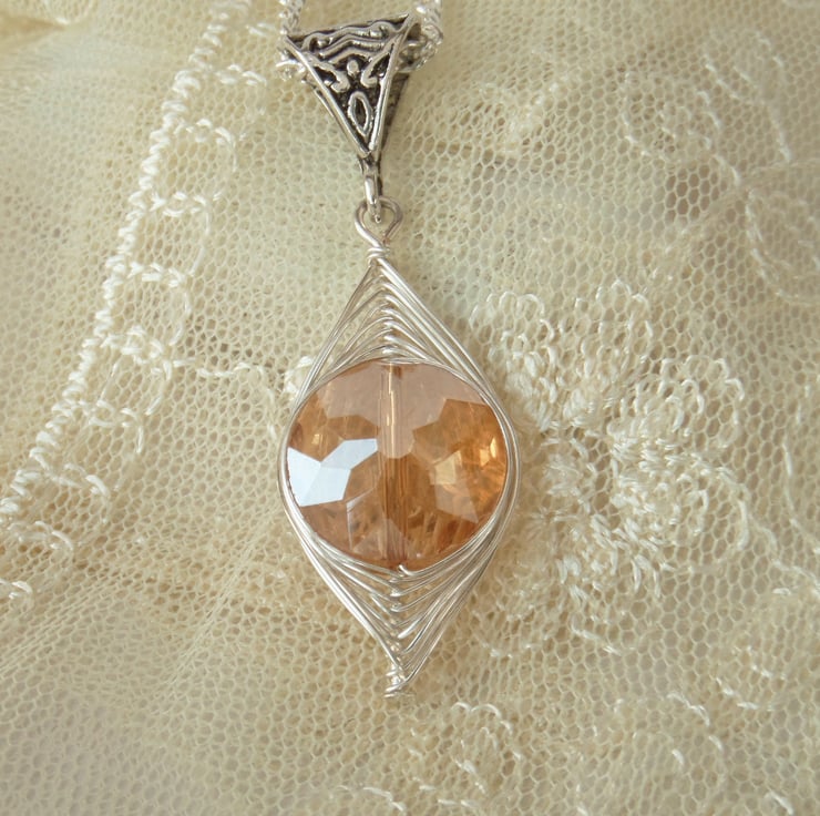 I love the effect of framing this delicate peach crystal within the herringbone wire wrapping.