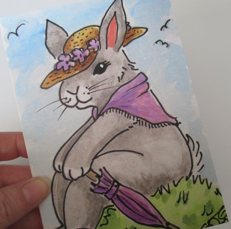 The original art was a small painting of my bunny, Lady Jane, in cartoon style. She is a bit of a diva, and is sat posing in her hat, shawl and parasol.