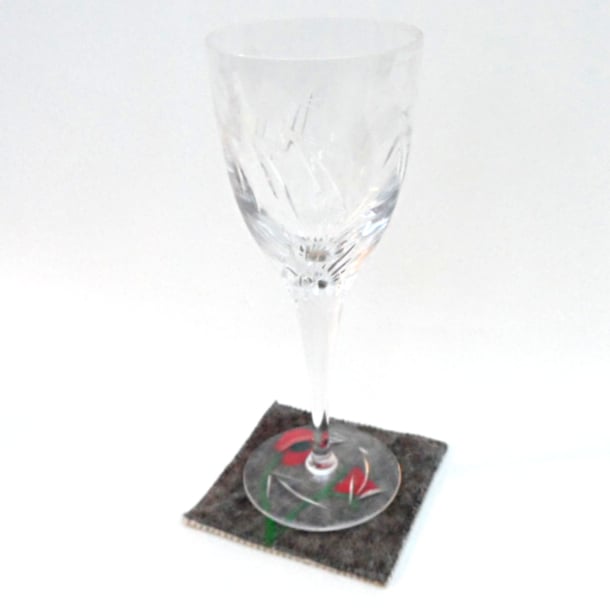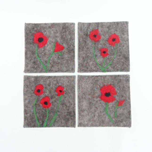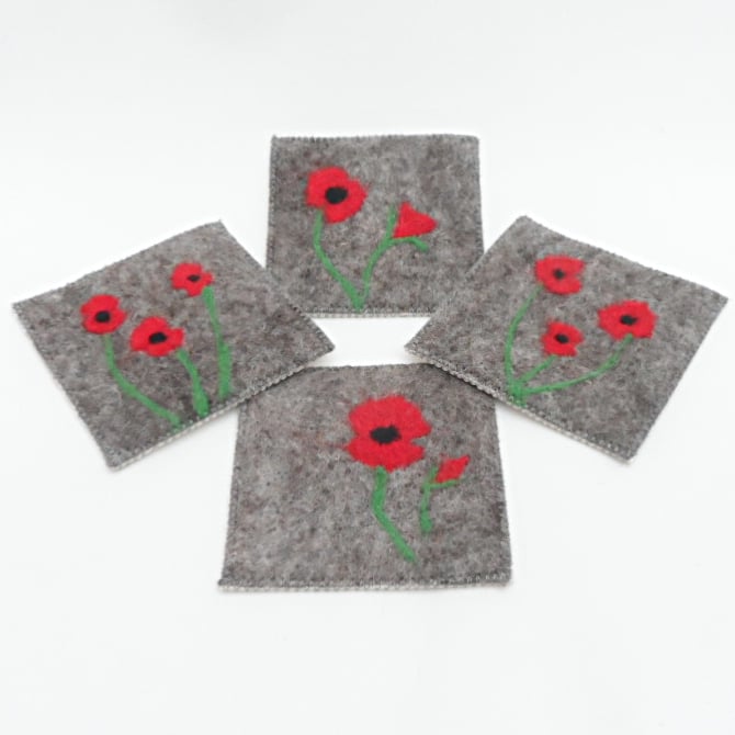 This lovely set of 4 coasters are made from hand felted natural grey jacob wool with a needle felted poppy design using merino wool. They have been backed with a table protector material to add to the natural heat resistant properties of wool, making them suitable for use with hot drinks. The coasters measure approximately 9.5cm x 9.5cm perfect for a glass of wine or cup of coffee.There are four separate designs, you will receive those shown in the photos.