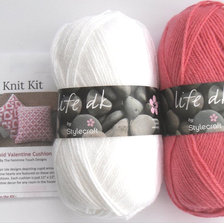 Knitting kit for 2 coordinated valentine hearts and cupid arrows cushions / throw pillows.