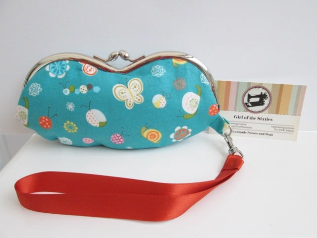 Charming little wristlet purse for glasses, sunglasses or mobile phone in pretty butterflies fabric with removable wrist strap in contrasting fabric