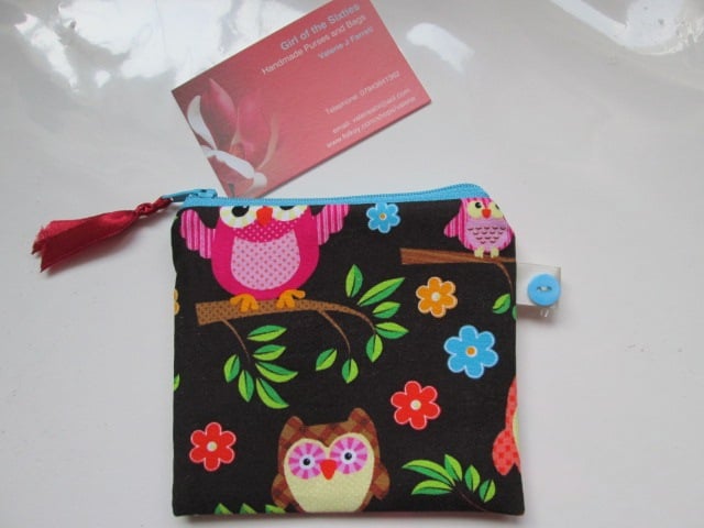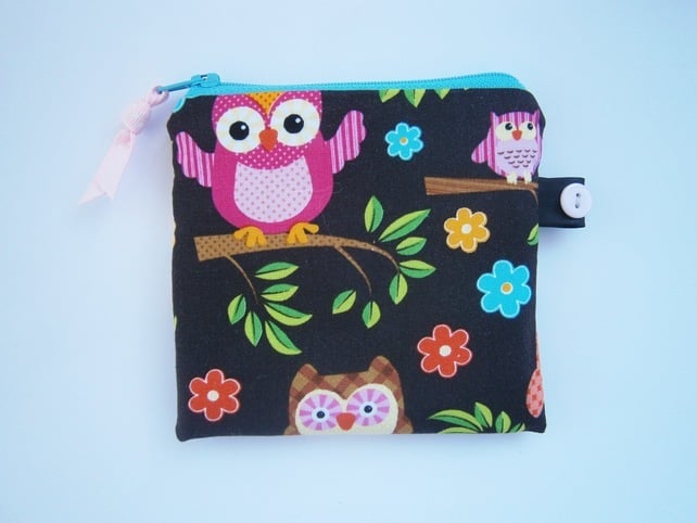 Cute little owls print coin purse with contrasting zip and lining. Perfect for your cards, notes and change, even your mobile phone and lippy.
