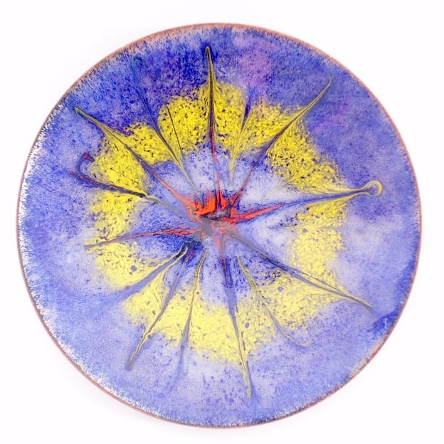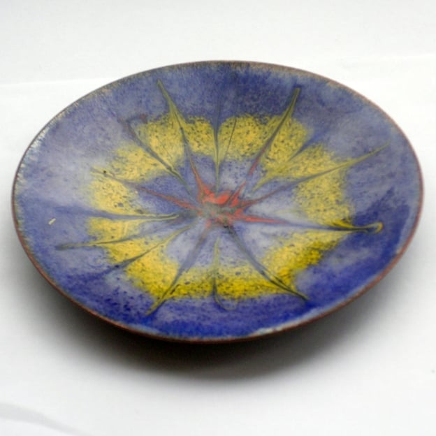 This dish features an eight point red starburst through an eight point yellow starburst over a royal blue background. It is a very simple but effective design in three bold colours.