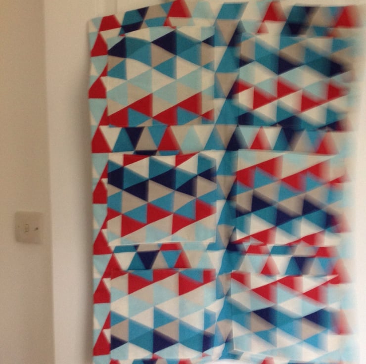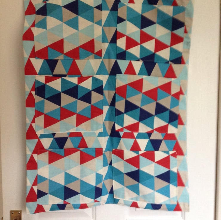 The material is a strong cotton with six large pockets on the front , in colours red white and blue, on the top are two handles to hang it .