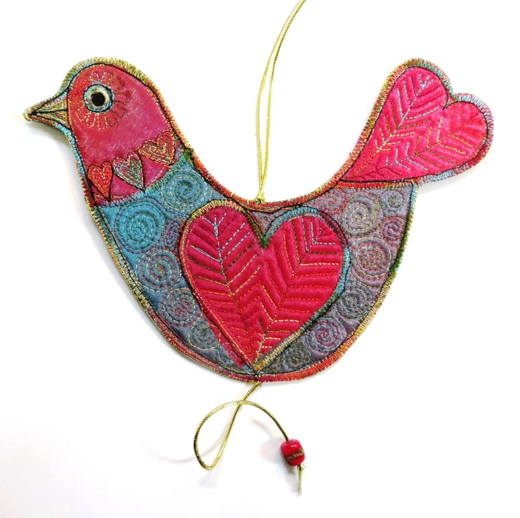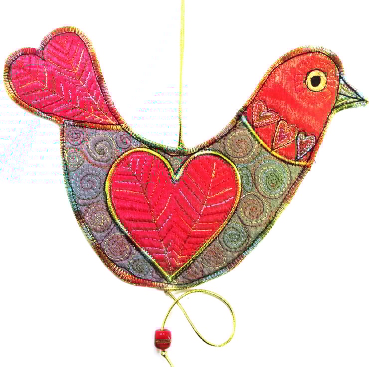 A handmade, machine stitched multilayered, multicoloured fabric bird, this is made from several layers of fabric including red silk and lots of free machine embroidery