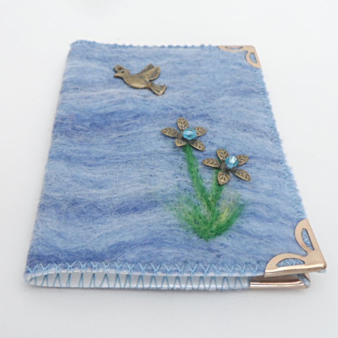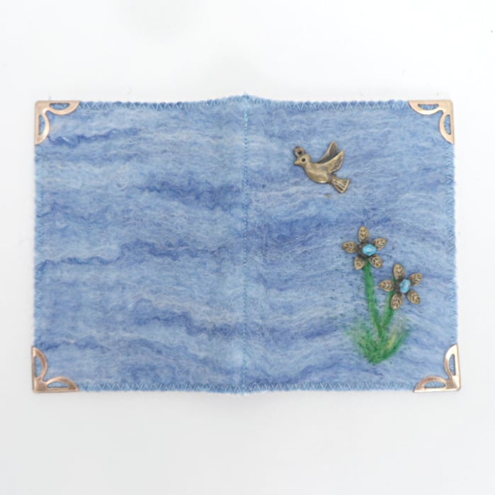 This card wallet has been made using a piece of hand made felt in blue shades of merino wool which has been securely stitched to a hardwearing white vinyl fabric with clear vinyl pockets. An antique bronze coloured bird charm and flowers, made using antique bronze coloured petals and acrylic bicone beads, have been added as decoration to the front cover. Gold coloured corner protectors have also been added.