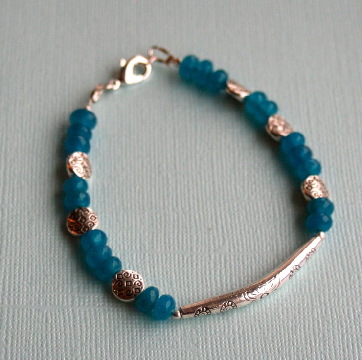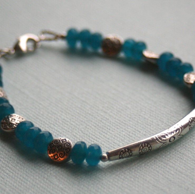 Beautiful blue and silver bracelet made with faceted rondelles of dyed blue quartz and decorated Tibetan-style silver plated beads. The bracelet is finished with a lobster claw clasp.