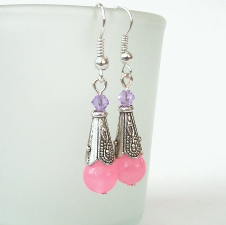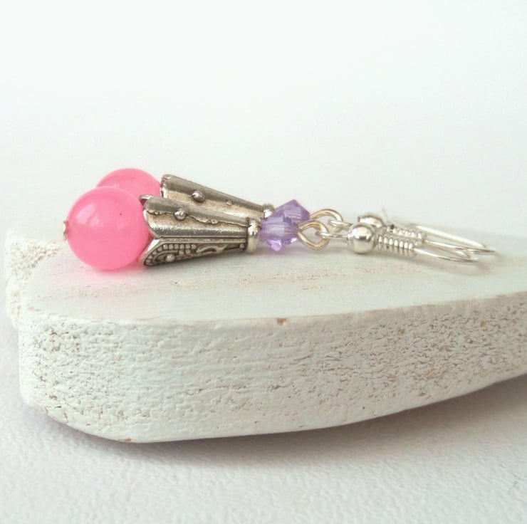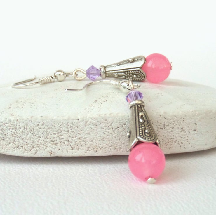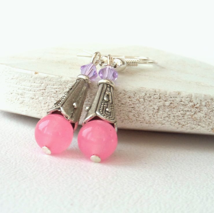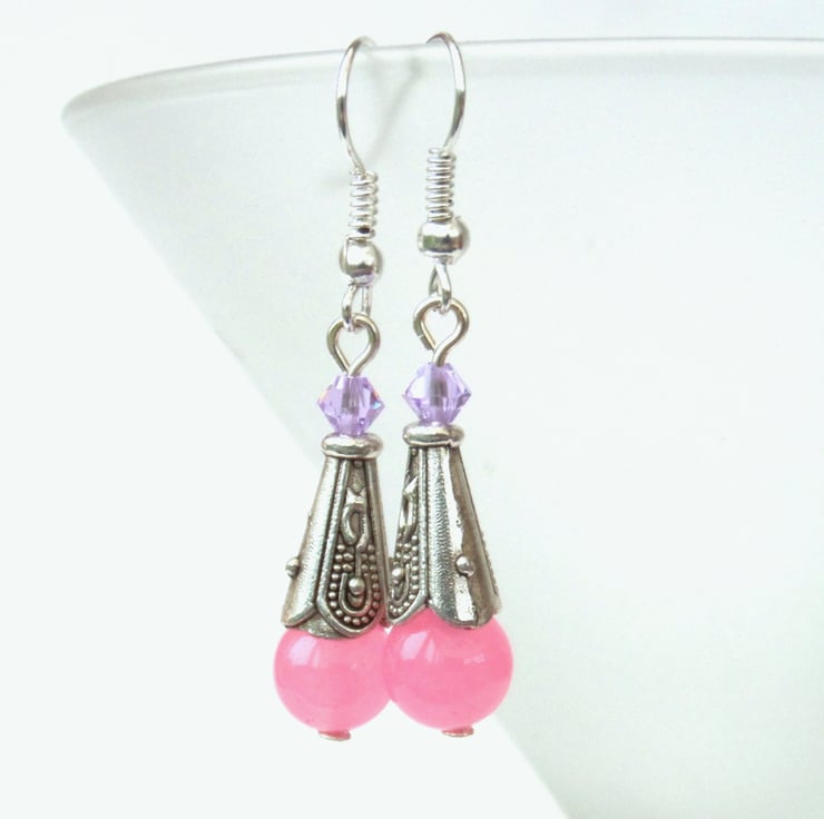 A lovely and unusual pair of handmade earrings, with jade dyed in a beautiful shade of pink.