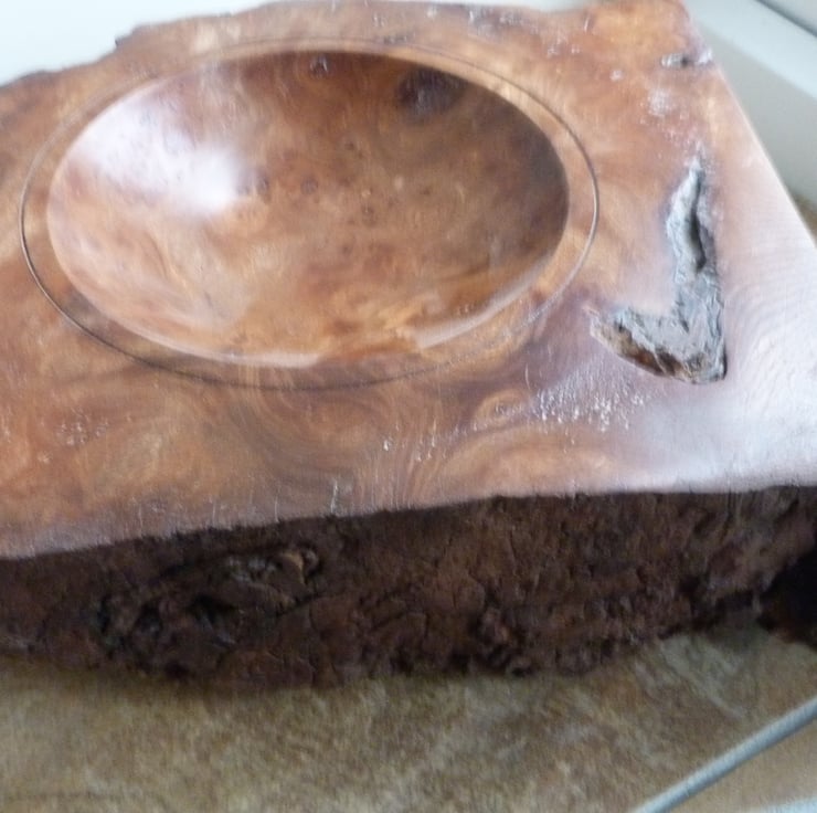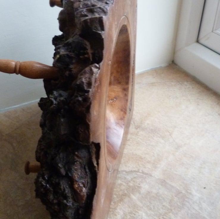 ENGLISH ELM GETS RARER EVERY YEAR, THEREFORE THE BURRS FROM ELM TREES ARE EVEN MORE DIFFICULT TO FIND.. THIS PIECE SITS ON THREE SHORT OAK LEGS, IT IS JUST 4'' AND ABOUT 9''BY 9''. THE BOWL PART IS OFFSET TURNED, WITH AN OPENING OF 5''. AS CAN BE SEEN IN THE PICTURES THE UNDER SIDE IS AS FOUND, A SMALL INTERESTING BOWL , FOR SMALL THINGS, NUTS-SWEETS PERHAPS. DANISH OIL TO FINISH.