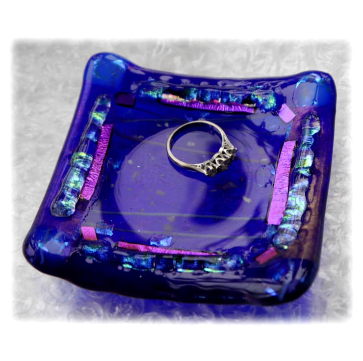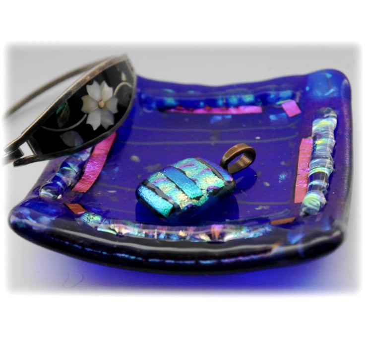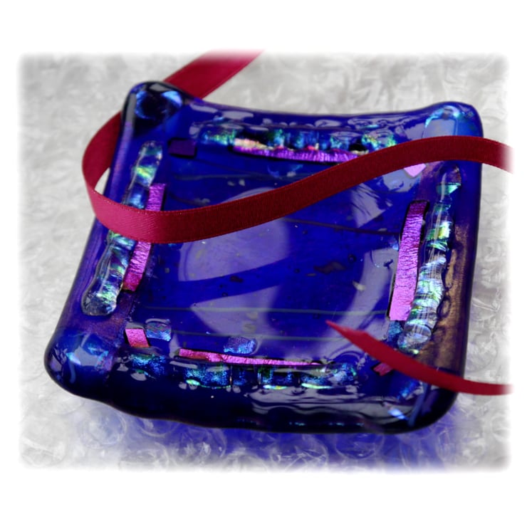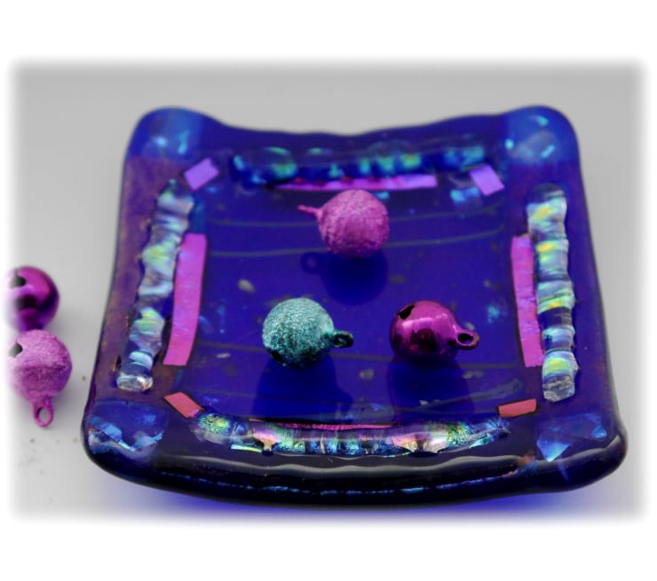I've used an iridescent rich blue for the base which has purple shimmers and it is topped with a collage lined and frit scattered glass.