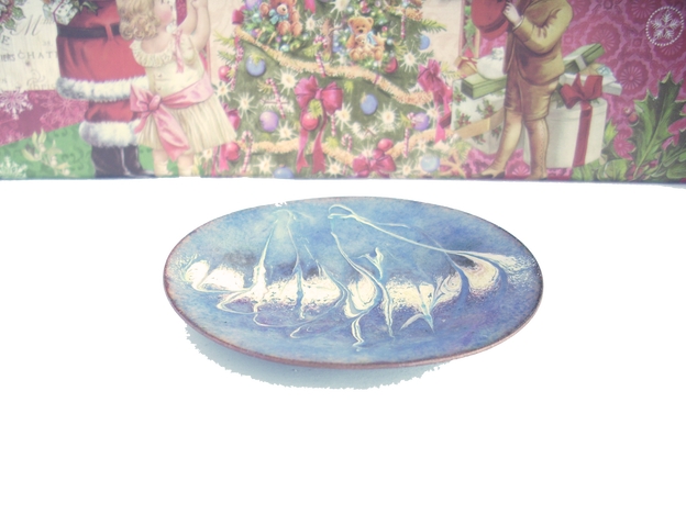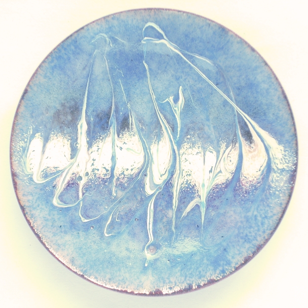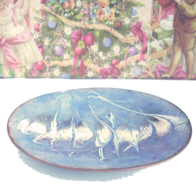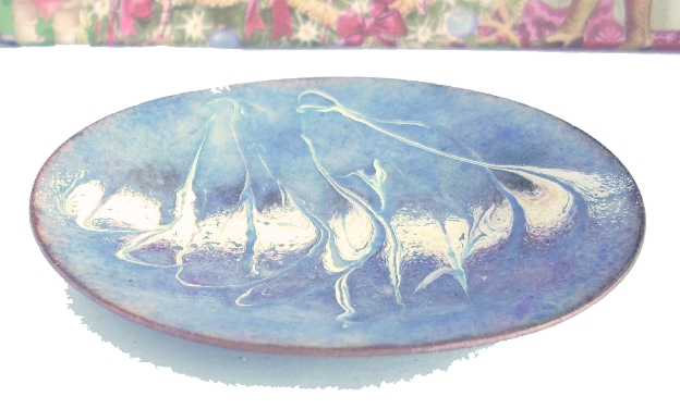 The scroll work on this dish is drawn through a line of white enamel, embellished with gold and pink, laid across the width of the centre of the dish. One effect that the pattern suggests is of a flock of long-necked, long-legged birds wiewed through mist. On the other hand I was just trying to create an eye catching pattern.