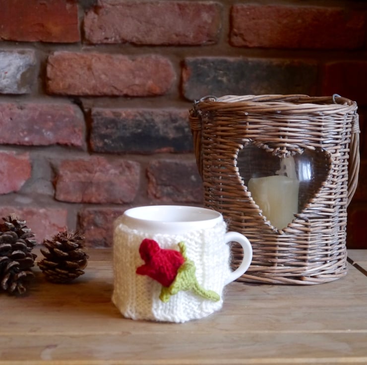 A lovely red rose adorns this romantic mug cosy. A perfect gift for the love of your life or anyone who loves flowers. All hand knitted with good quality yarns. The cream cosy has a ribbed effect and has a wooden button to fasten around mug.