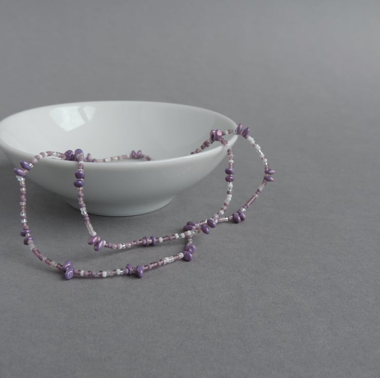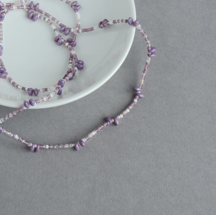 Created using a mix of spiky Czech glass beads and Japanese seed beads, this long, mauve necklace features a palette of lilac, pink and frosty hues.