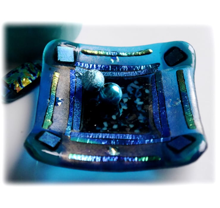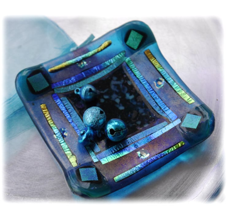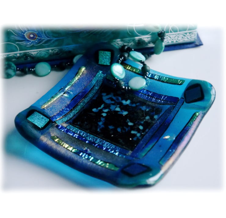 I've used a clear turquoise glass for the base then added a border of teal iridescent glass. The centre is filled with a mixture of turquoise and teal frit.