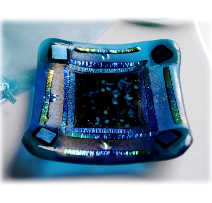 A little, 8.5 cm square dish, three times fired in my kiln, first to full fuse all the glass together, 2nd to tack fuse a border in relief and 3rd to slump it over a little mould into a shallow dish shape.