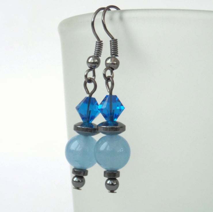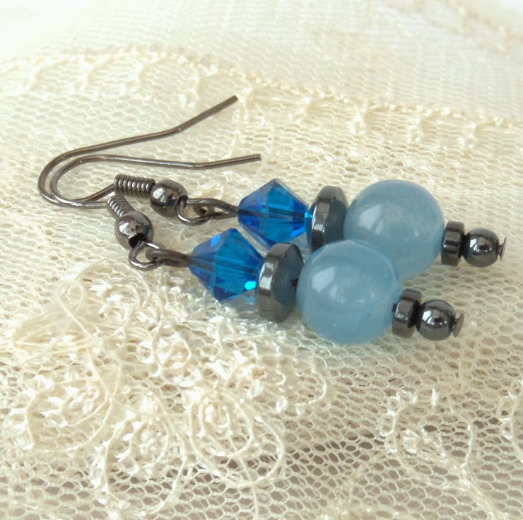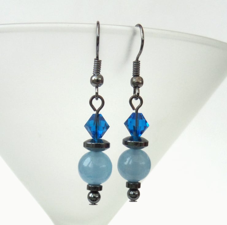 I love the contrasts of the colours and materials in these earrings - the two blues look great together and the hematite and gunmetal wires contrast wonderfully with them.