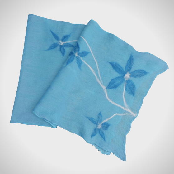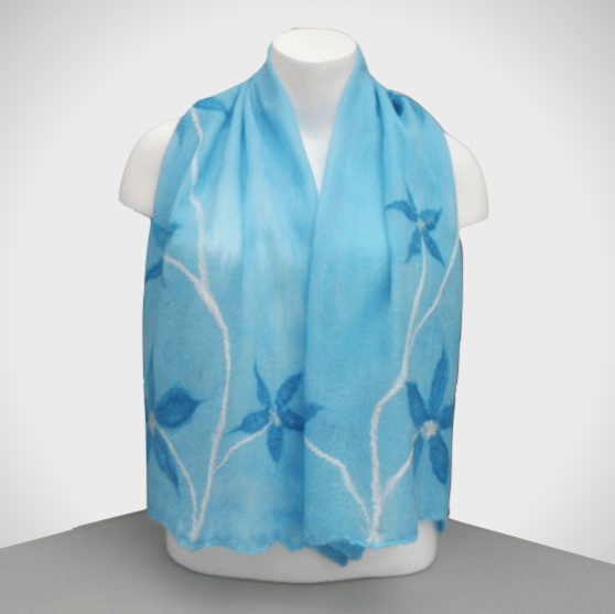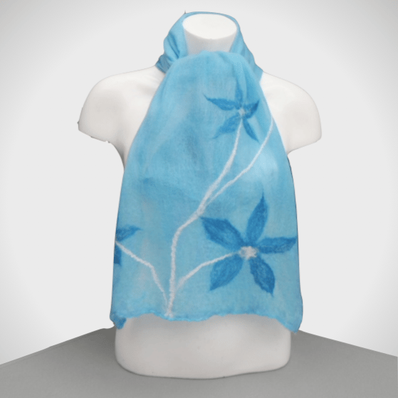 This beautiful nuno felted scarf has been made using gorgeously soft, pale blue merino wool which has been nuno felted to both sides of a blue silk chiffon scarf. A floral decoration using darker blue merino wool blended with bleached tussah silk fibres has been added to one side prior to felting. The reverse side is felted but left plain.