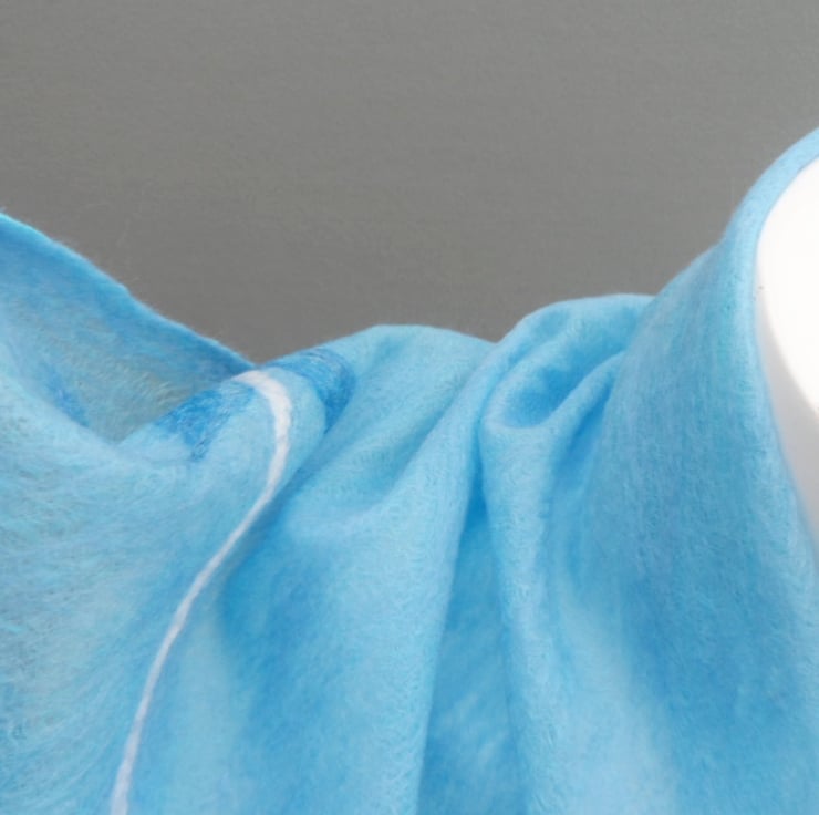 Nuno felting is a process whereby woollen fibres are made to migrate through the underlying silk fabric and bind with it to produce a new material. The resulting scarf is super soft, lightweight and drapes beautifully.