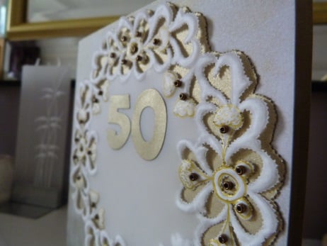 A completely handmade and uniquely designed card. Consisting of parchment which has been embossed and cut into an ornate circular design. This has been embossed and cut out into a modern floral pattern. Finished of with gold beads. The central panel has the number 50 in gold. Mounted onto gold paper, then onto quality pristine white card which has been coloured in goldl.