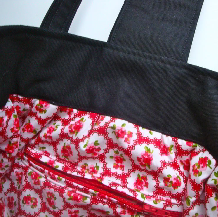 Closure is a magnetic clasp underneath front tab . Bag is fully lined in a floral cotton fabric , and lightly padded for extra body and softness . I have also added a handy internal zip pocket for keeping your valuables safe .