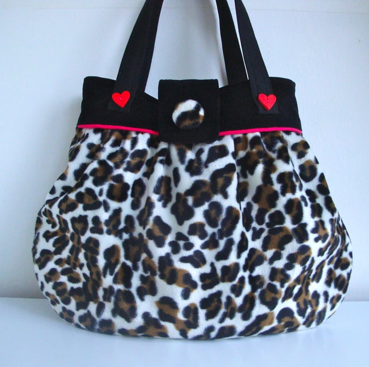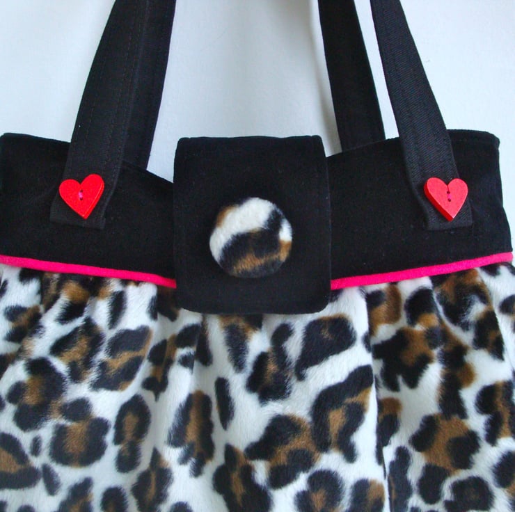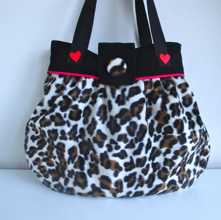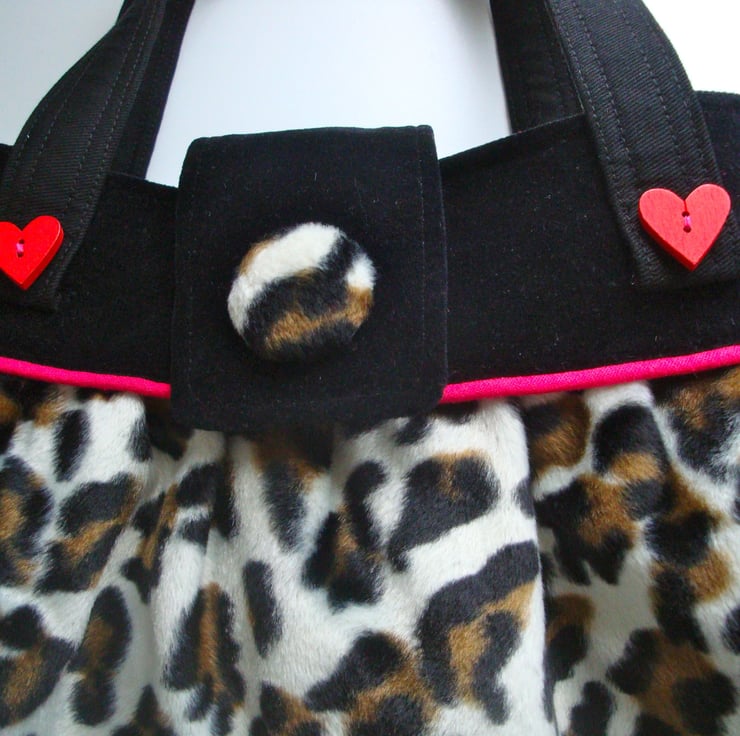 I made this funky handbag in a faux fur animal fabric , and combined it with a black cotton velvet yoke , and a raspberry pink piping inserted in the seams .