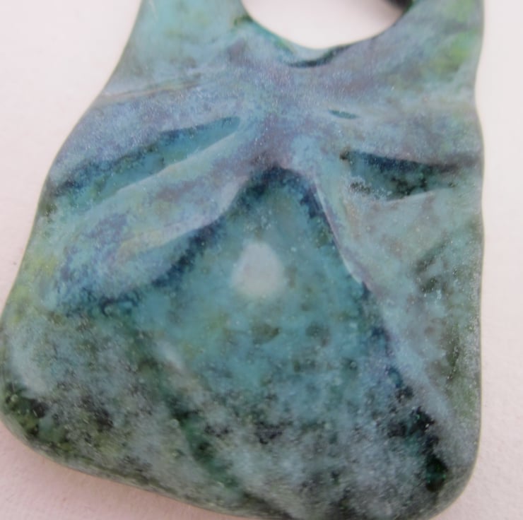 It is a stunning ornament, with multiple layers of dark blue and green frit, including sparkling aventurine, creating a beautiful marbled effect. The surface is textured to provide a contour of a dragonfly making this a very tactile piece. This is a unique and eye catching piece of costume jewellery.