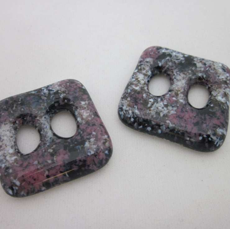 These button are made with dark pink frit cast within an vanilla base and encased in clear glass. The pink glass has reacted with the sulphur in the vanilla glass making a truly unique reaction, like marble veining. Some of the pink has darkened to almost black.They are approximately 4cm across. They will be perfect to fasten a bag or hand knit cardigan.