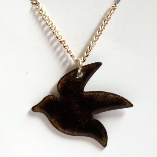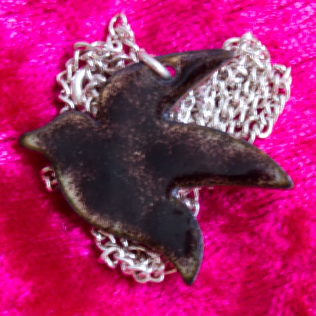 This bird is decorated with a layer of black enamel over a base of clear enamel. The copper base glints through the black giving a golden-brown shimmer to the bird.