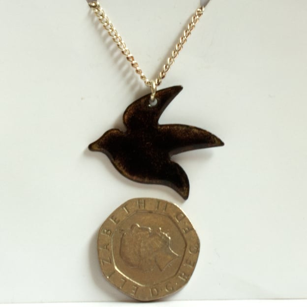 The bird measures 24mm, wing-tip to wing-tip, 28mm beak to tail. It is mounted on a 45cm curb chain that secures with a bolt ring.