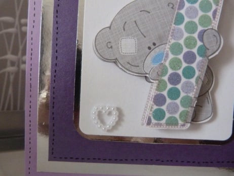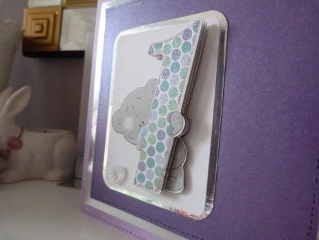 A completely handmade and uniquely designed card. Consisting of a No 1 with a cute teddy hiding behind decoupage mounted onto whit card, then onto silver mirri card then onto purple pearl card,then silver mirri, then lilac card. Finished off with birthday wishes and a cute pearl heart.,