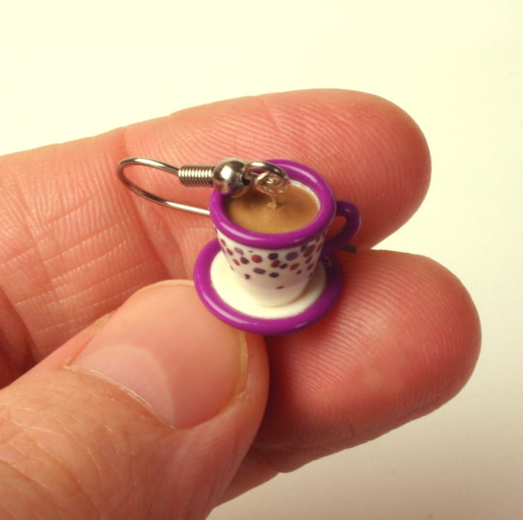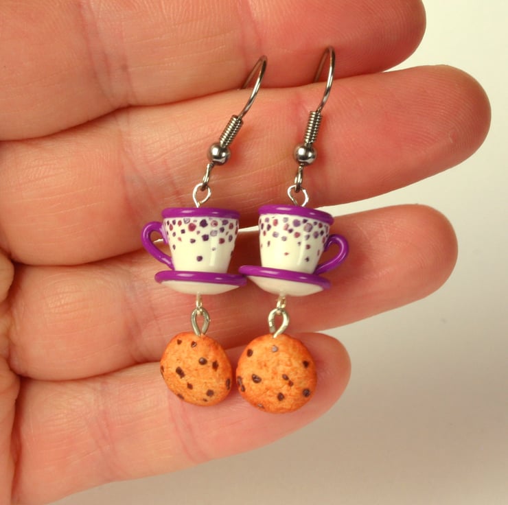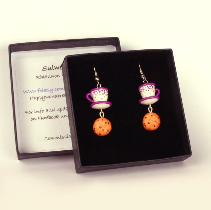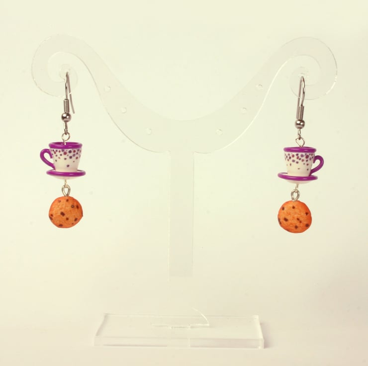 If you are a Tea drinking connoisseur you may wish to proclaim your mastery of the art by wearing these fancy tea and biscuit earrings! Each teacup has been handmade from polymer clay then decoratively painted and varnished. As tasty as they look, the little cookies are also handmade from polymer clay. Both elements have then been brought together and hung on Hypo allergenic surgical steel ear wires.